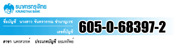 ![]() ![]() เลขบัญชีธนาคาร สำหรับโอนชำระค่าสินค้า![]() ![]() เมื่อโอนชำระค่าสินค้าผ่านทางธนาคารแล้ว ลูกค้า่สามารถแจ้งได้ทางหน้าเวป ที่เมนู ( แจ้งการชำระเงิน ) พร้อมระบุรายละเอียดสินค้าที่สั่งซื้อ และ ชื่อผู้รับสินค้าและสถานที่ส่งสินค้า หรือ ลูกค้าสามารถ โทรศัพท์ แจ้งการชำระเงิน ได้ที่เบอร์ 086-9054554 คุณ นก พร้อมรับข้อมูลตลอดค่ะ สมใจดอทคอม จะทำการติดต่อกลับไปยังลูกค้าเมื่อได้รับข้อมูลการสั่งซื้อ เพื่อแจ้งทบทวนข้อมูลสินค้า พร้อมสถานที่ในการจัดส่งสินค้าในทันที เพียงเท่านี้ ลูกค้ารอรับสินค้าอยู่ที่บ้านแบบสบายๆ ตามคำขวัญที่ว่า นึก คิด ฝัน เป็นไปได้สมใจ ขอขอบพระคุณลูกค้าทุกท่านที่ให้ความอุปการะคุณในการสั่งซื้อสินค้า มา ณ โอกาสนี้ ขอบคุณจากใจ ทีมงานสมใจช๊อปปิ้ง ![]()